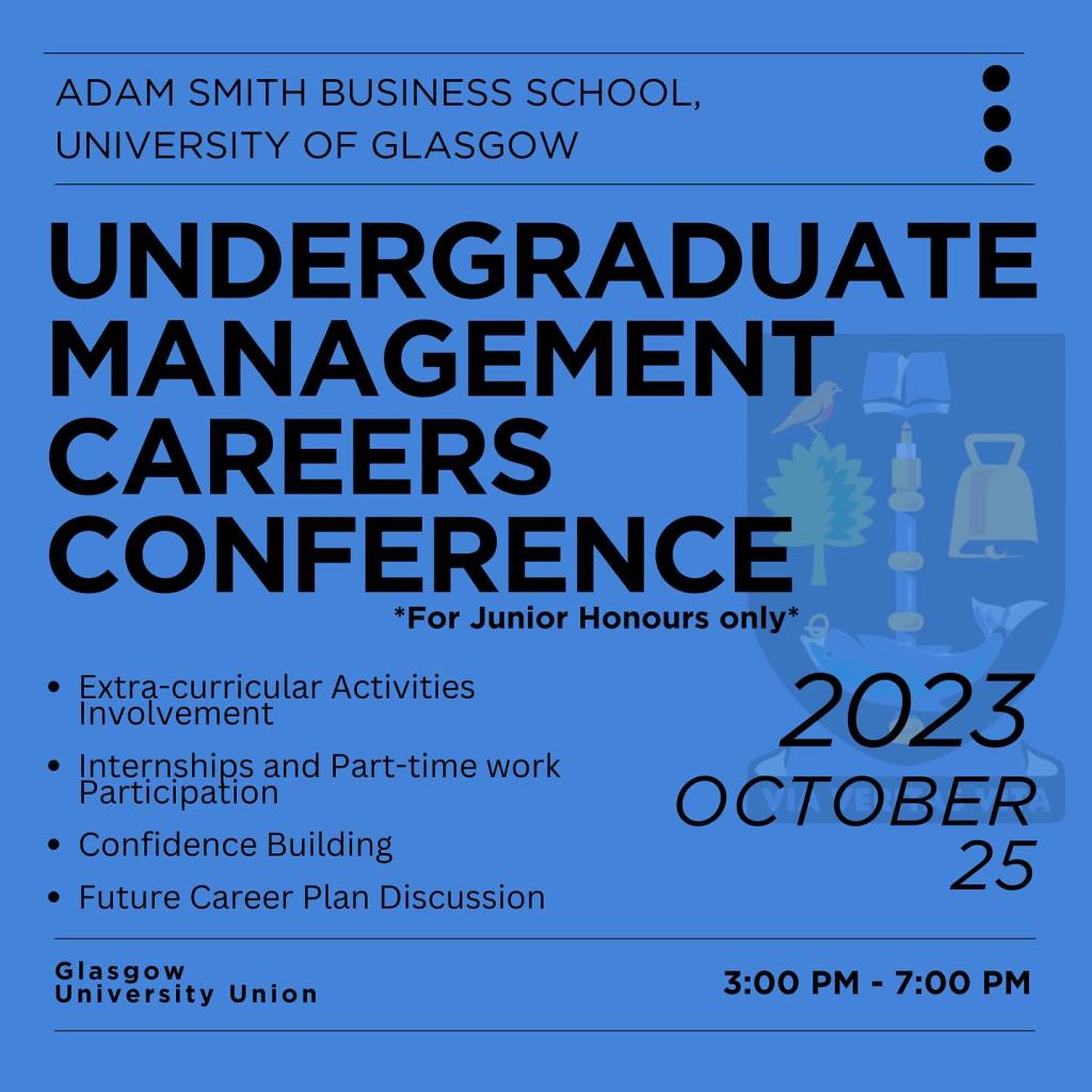 The Adam Smith Business School, Glasgow University is excited to host its first Undergraduate Management Careers Conference on Wednesday, 25th October, from 3:00 PM – 7:00 PM at the Glasgow University Union.