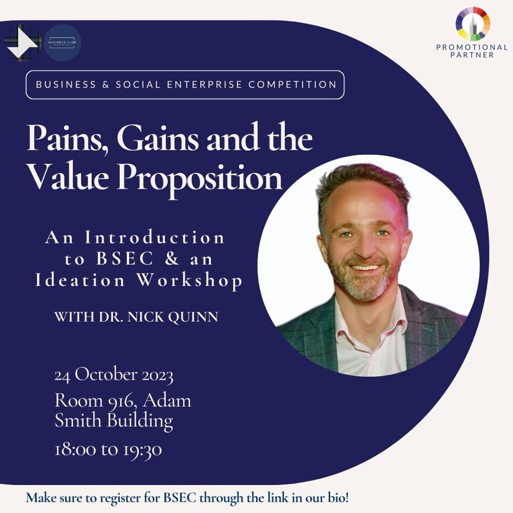 Join the first workshop in our series, ‘Pains, Gains, and Value Proposition’, led by Dr. Nick Quinn, Senior Lecturer in Entrepreneurship. This session will help you refine your idea and set you up for success, with plenty more workshops to follow to guide you from ideation to presentation.